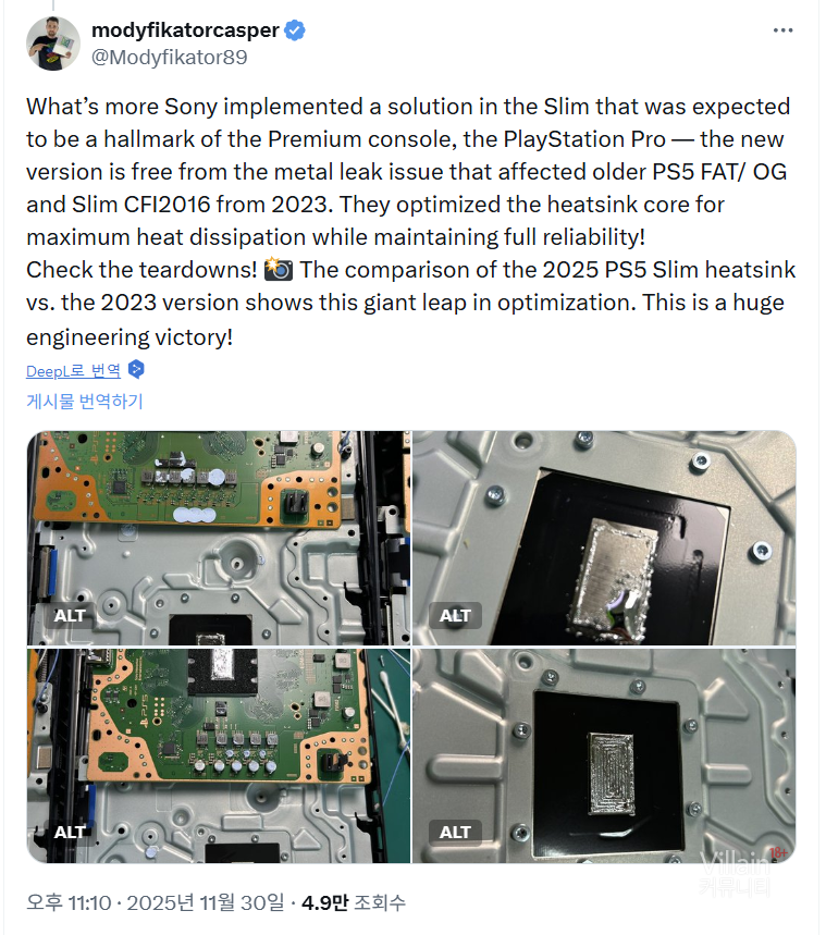 그리고 기존 PS5·PS5 Slim에도 동일한 TIM 구조가 적용되는 것으로 보인다. 하드웨어 분석 계정 @Modyfikator89 에 따르면, 최근 생산된 CFI-2100 / CFI-2200 시리즈 모델에서 PS5 Pro와 동일한 홈 패턴이 발견된다. TIM 접촉부 표면에 홈이 새겨져 있으면 최신 개선판, 완전히 평평하면 구형 모델이다.