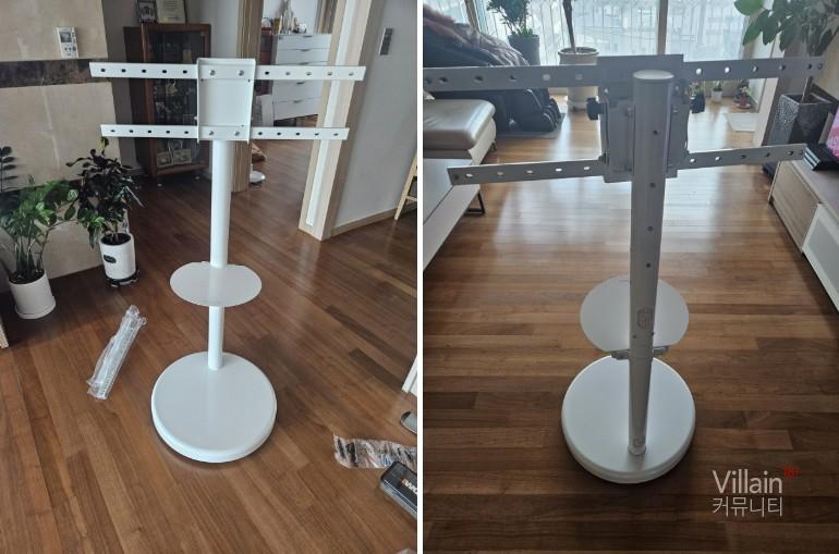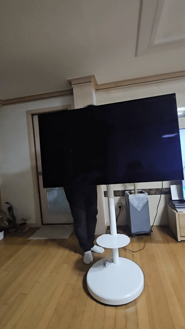 휠이 부드럽고 하부 지지 무게 덕에 무겁고 큰 TV를 거치해도 흔들리거나 불안한 느낌이 안들 정도로 안정적이면서도 부드럽게 움직였으며, 틸트나 피벗 또한 장력 조절을 하여 쉽게 조절 할 수 있다는 점도 좋았습니다.