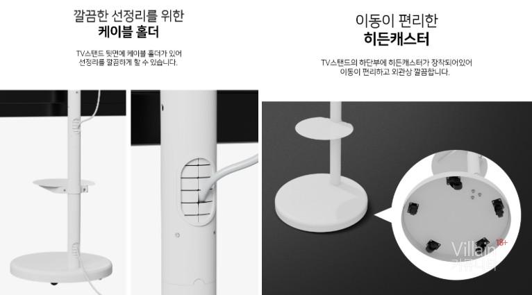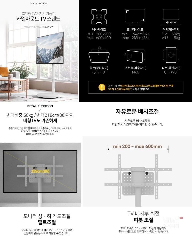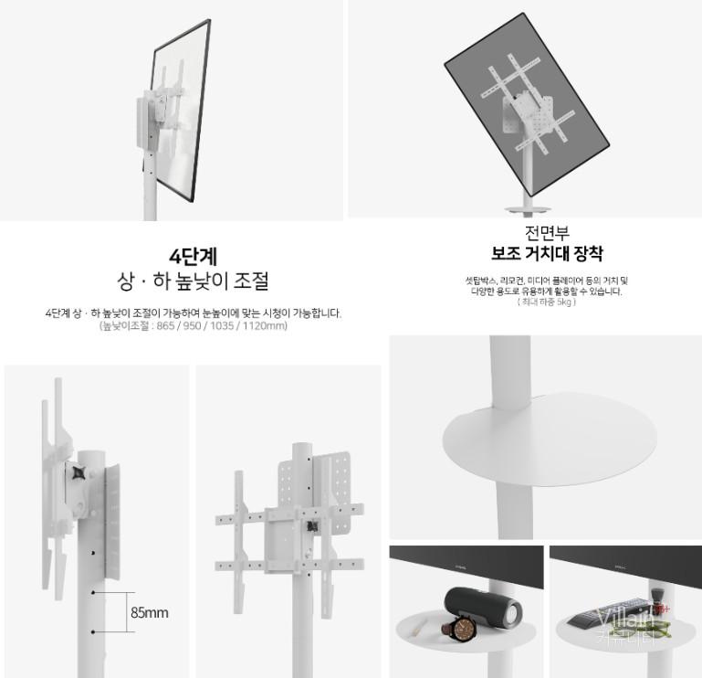 제품 특징을 보면 최대 86인치, 무게 50Kg 초대형 TV도 안정적으로 거치가 가능하며, 5~-10도 틸트, 0~90도 피벗, 4단계 높이 조절이 가능하며, 전면부 5Kg까지 하중을 견딜 수 있는 거치대가 제공되고, 베사부 후면 멀티 타공판이 있어 멀티탭 및 셋탑박스 등을 거치하여 자유롭게 움직일 수 있다 소개하고 있습니다.