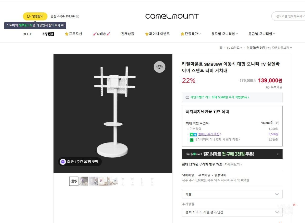 초대형 이동식TV거치대 SMB86W는 리뷰 작성 당일 기준 139,000원이였습니다