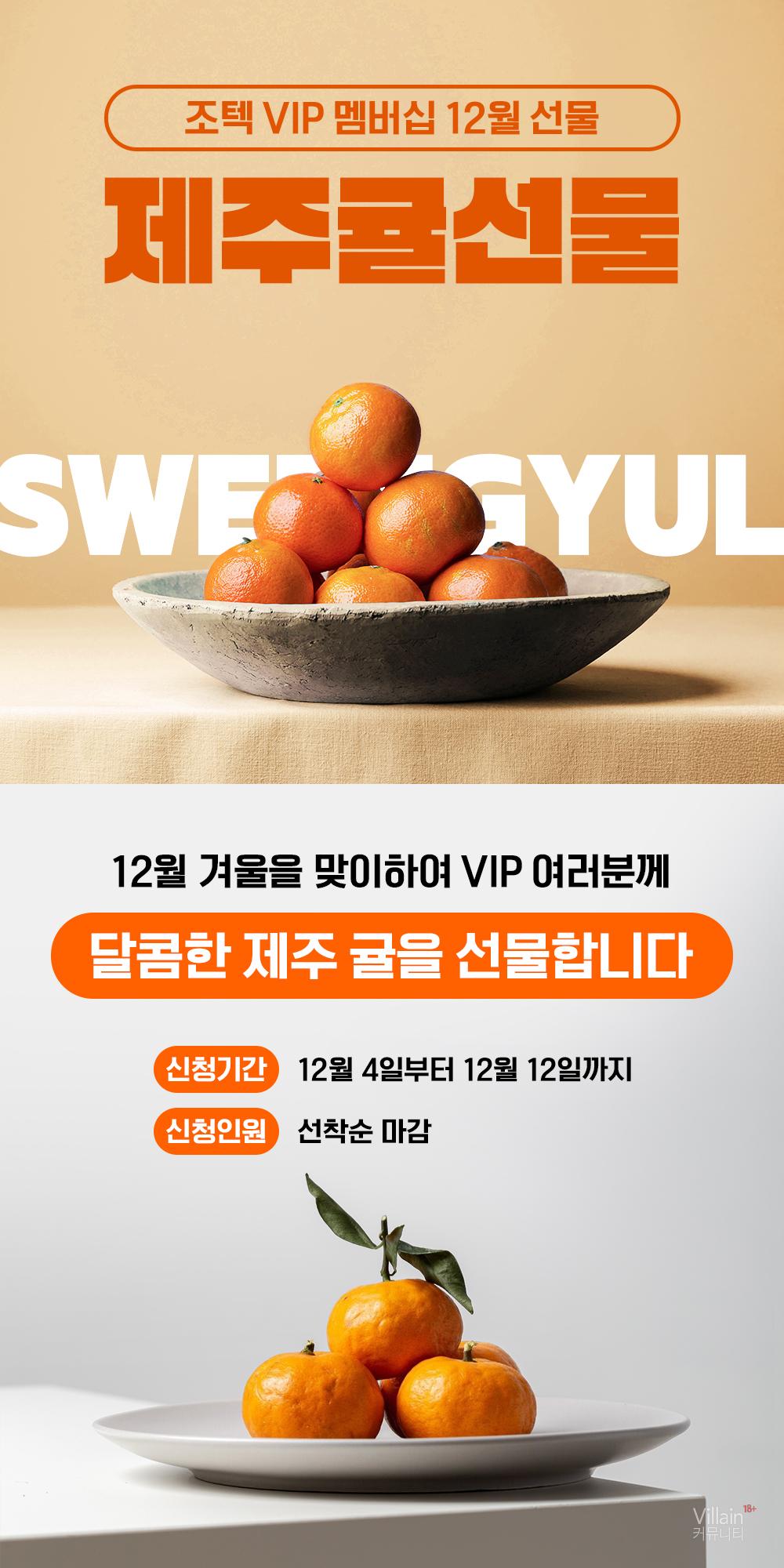 조텍 VIP 멤버십의 12월 리워드는 달콤한 제주귤이다. 조텍 VIP 멤버십 회원 중, 선착순을 통해 수량 한정으로 제주귤을 1박스 증정한다.