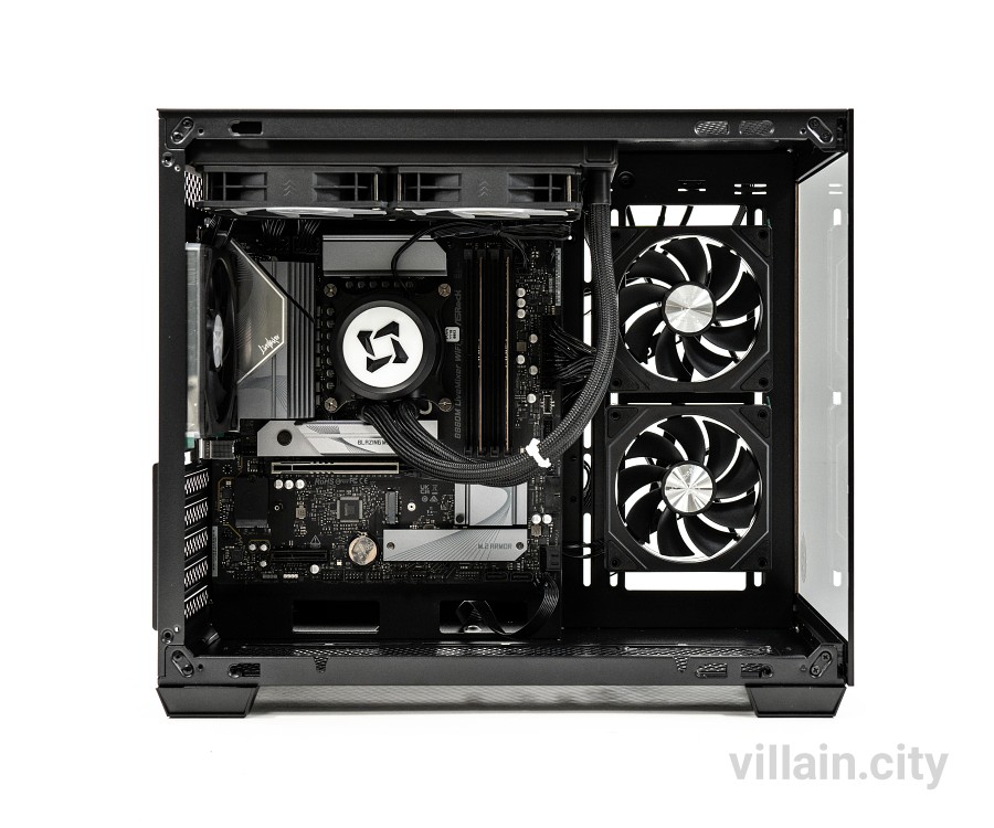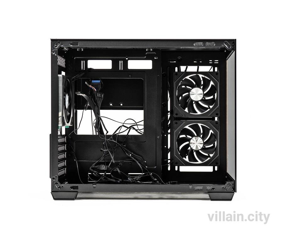 케이스 내부에는 최대 9개까지 냉각팬을 장착 가능한 공간이 준비됐다. 상단에는 120mm 3개 혹은 140mm 2개를 장착할 수 있다. 우측면에는 기본제공하는 HDR aRGB PWM 120mm 2개가 탑재됐는데 이걸 떼어낸다면 140mm 2개를 장착 가능하다. 바닥면에는 120mm 3개 장착이 가능하며 후면에는 HDR aRGB PWM 쿨링팬 120mm 1개가 기본 탑재됐다. 상단과 우측면, 바닥면에는 최대 160mm 고성능 공랭쿨러까지 탑재할 수 있다.