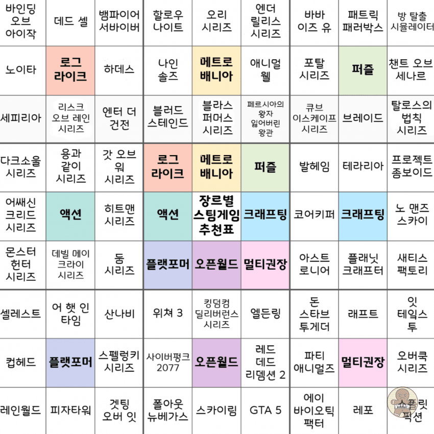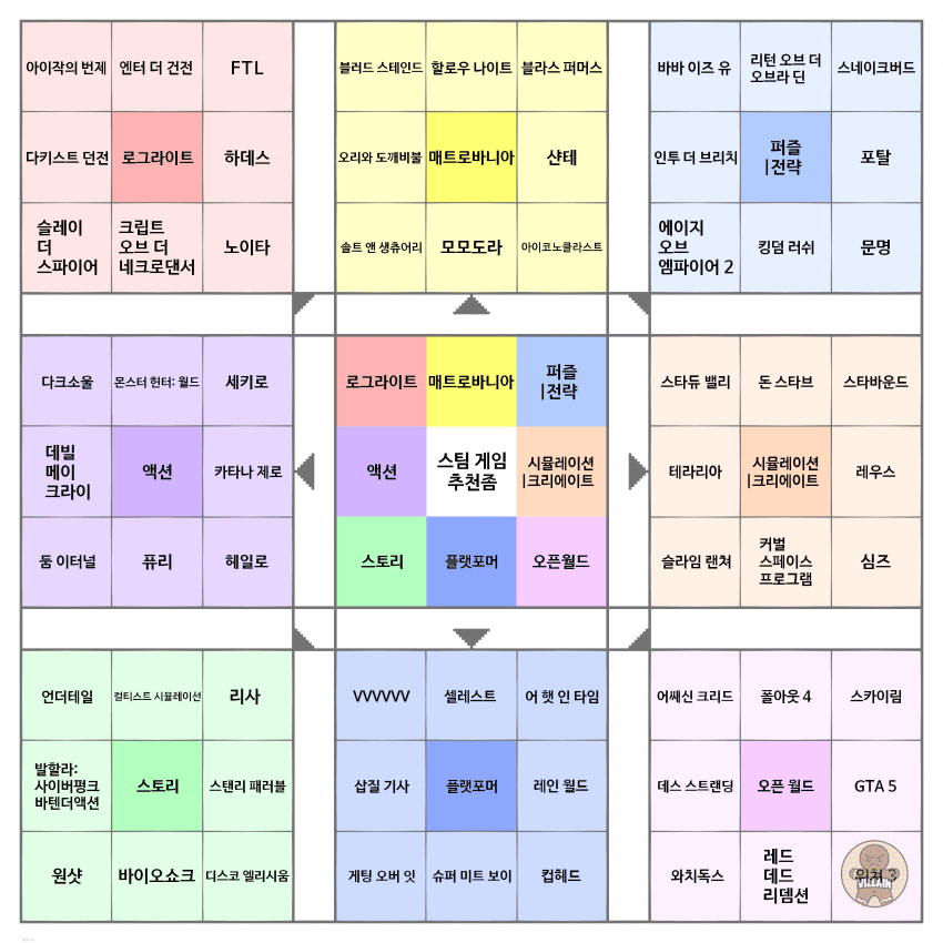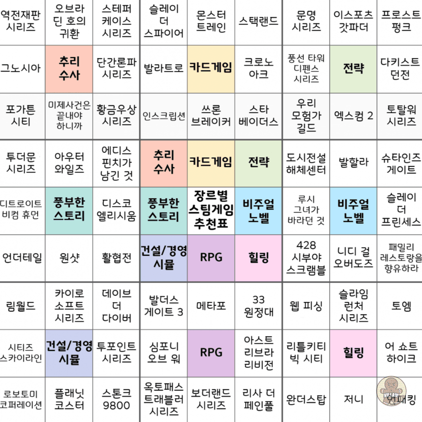 장르별로 스팀 게임을 잘 정리한 추천표가 있어 퍼왔습니다.
