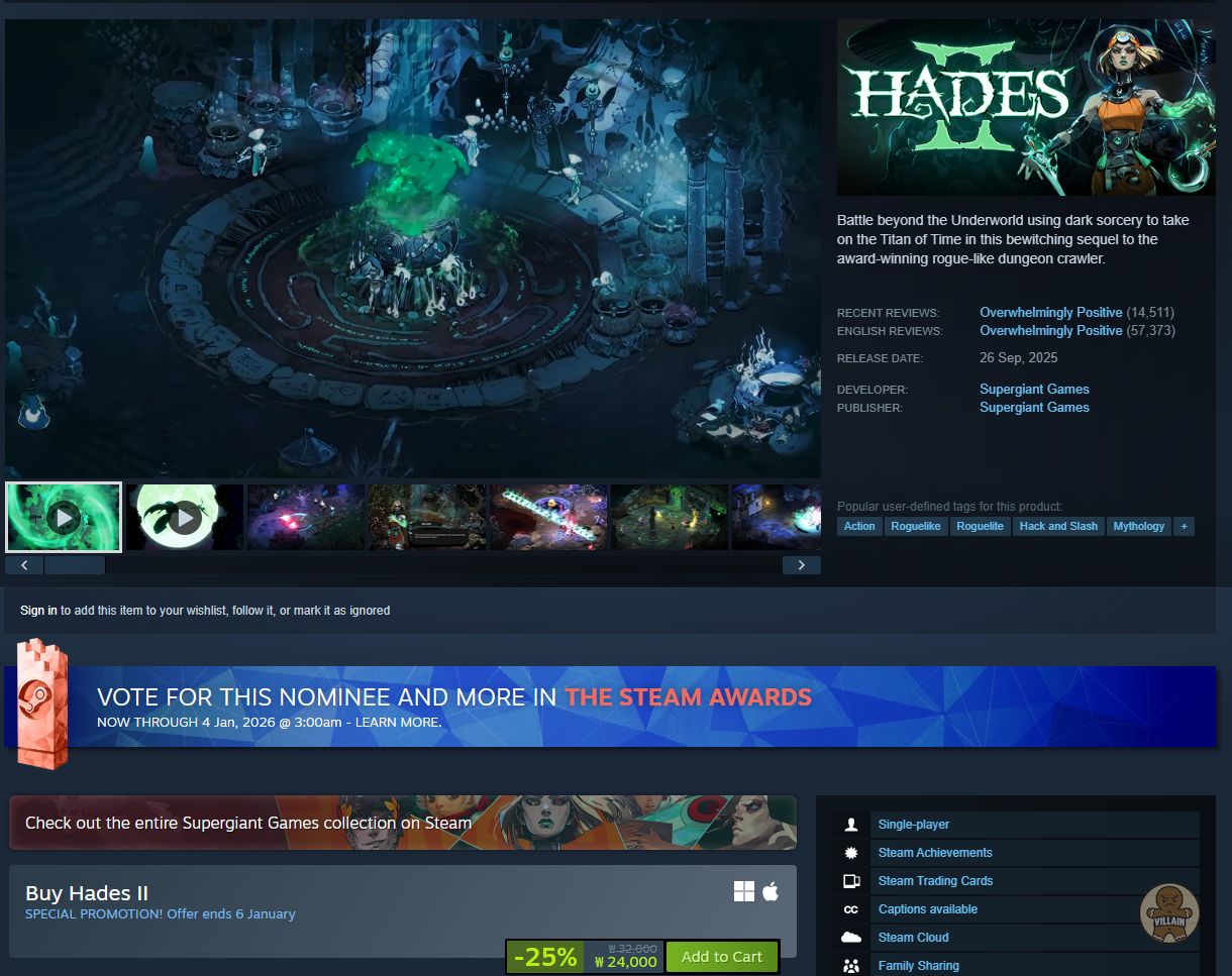 이번 세일기간 구매 예정인 게임은 하데스II 인데 지금 25% 세일 중 입니다.