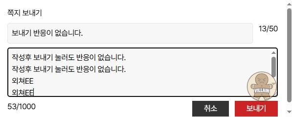 쪽지 보내기에서 내용 작성후 보내기를 클릭해도 반응이 없습니다.