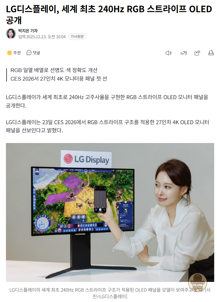 LG디스플레이, 세계 최초 240Hz RGB 스트라이프 OLED 공개