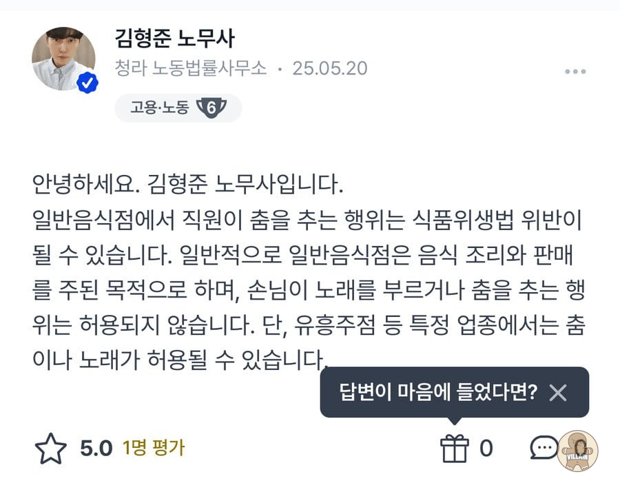 일반 음식점에서 직원이 춤을 추는건 식품위생법 위반이라고 하네요..