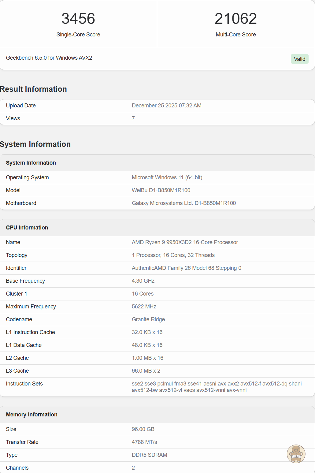 그럼에도 불구하고, AMD 라이젠 9 9950X3D2의 첫 번째 벤치마크 결과가 유출된 것으로 보입니다. 이 결과에 따르면 최대 192MB의 3D V-캐시가 탑재된 것으로 나타났지만, 패스마크(PassMark) 결과는 조작될 가능성이 있으므로 이 유출된 벤치마크 결과는 신중하게 받아들이는 것이 좋습니다. 또한, 긱벤치(Geekbench) 벤치마크 결과도 유출되었는데, 이 결과에서도 새로운 3D V-캐시 칩의 성능이 확인되었습니다. 그럼 이제 9950X3D2의 사양을 살펴보겠습니다.