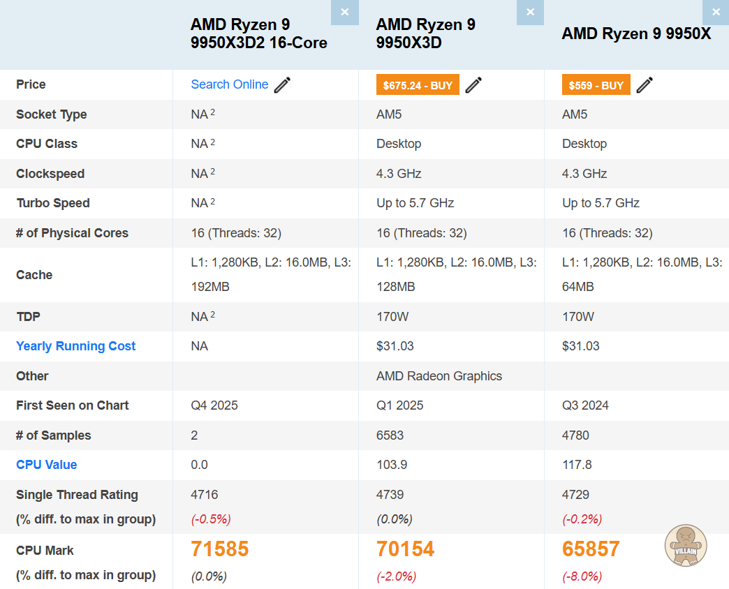 AMD가 클럭 속도 향상과 캐시 용량 증가를 통해 기존 라이젠 9000X3D "3D V-캐시" CPU 라인업 을 새롭게 단장할 준비를 하고 있다는 사실은 이미 알려져 있습니다. 라이젠 7 9850X3D는 벤치마크 결과 와 소매점 판매 목록 에 등장했고, AMD 자체 에서도 출시를 확정했기에 이미 널리 알려진 제품입니다. 하지만 라이젠 9 9950X3D2는 아직 소매점 판매 목록에 등재되지 않아 출시 계획은 여전히 불투명한 상태입니다.