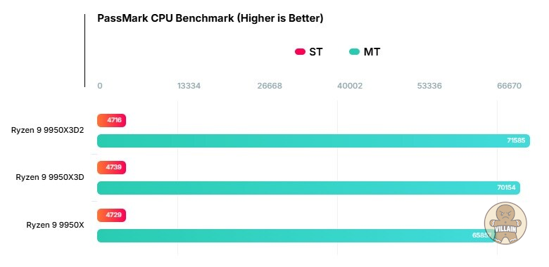 성능 측면에서 PassMark 벤치마크를 보면 AMD Ryzen 9 9950X3D2는 Ryzen 9 9950X3D와 비슷한 성능을 보여줍니다. 이는 게임 성능이 아닌 단일 스레드/멀티탭(ST/MT) 성능을 보여주는 합성 워크로드이기 때문에, 9950X3D2의 클럭 속도가 100MHz 낮다는 점을 감안하면 당연한 결과입니다. 따라서 주요 차이점은 애플리케이션 성능보다는 게임 성능에 있으며, 그마저도 추가 캐시를 활용할 수 있는 특정 게임에서만 차이가 나타납니다. 3D V-캐시 용량이 두 배로 늘어난 것을 활용하는 애플리케이션도 있겠지만, 전반적으로 캐시 사용량이 적은 작업에서는 9950X3D와 비슷한 성능을 보일 것으로 예상됩니다.