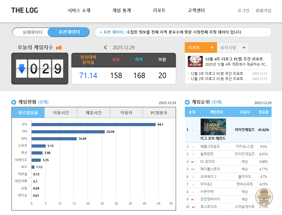 2025년 PC방 게임 이용 시간은 전년 대비 약 6% 감소한 약 7억8000만시간을 기록했다. 전체 가동률은 20%를 웃돌았다. 게임별 점유율은 '리그오브레전드(LoL)'이 36.01%로 1위를 차지한 가운데 'FC온라인(9.06%)', '배틀그라운드(8.42%)', '발로란트(8.03%)', '메이플스토리(5.43%)' 순으로 집계됐다. 상위 5개 게임의 총 점유율은 전년보다 4.25%p 감소했다.