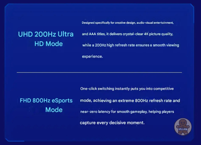 HKC는 이러한 문제점을 해결하기 위해 자체 개발한 고성능 디스플레이 드라이버 칩과 첨단 패널 기술을 활용하여 UHD 200Hz와 FHD 800Hz 듀얼 모드 간의 끊김 없는 전환을 가능하게 하는 혁신적인 "쿼드러플 주파수" 기술 개념을 제안 했습니다 .