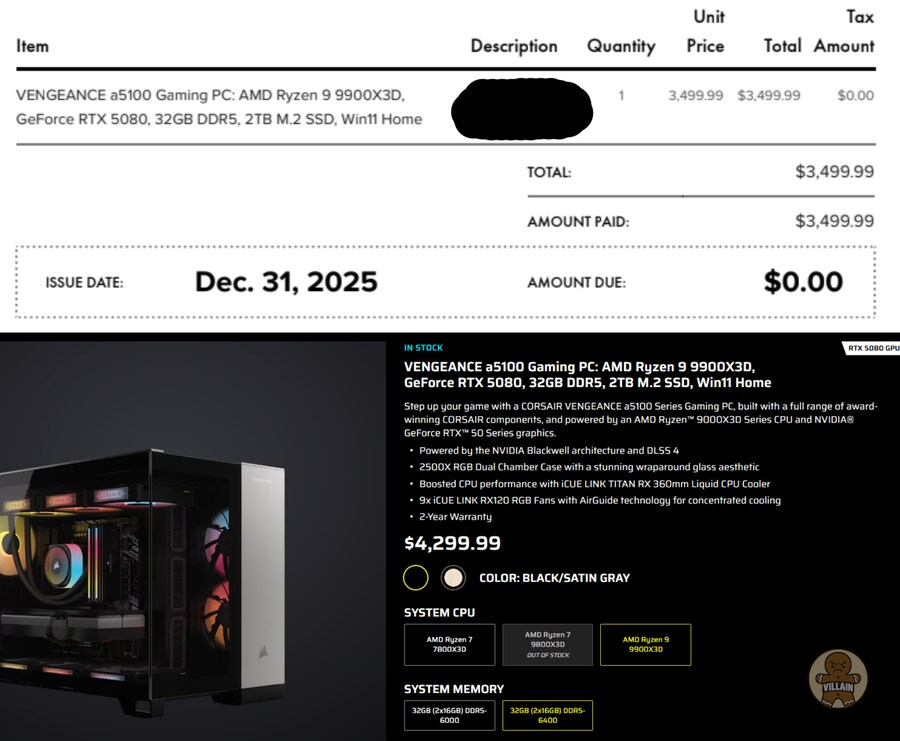 레딧 사용자 u/Senior_Ball_9068은 12월 31일 라이젠 9 9900X3D, RTX 5080, 32GB DDR5 RAM, 2TB 저장장치를 탑재한 커세어 벤전스 A5100 게이밍 PC를 주문했다고 보고했습니다.