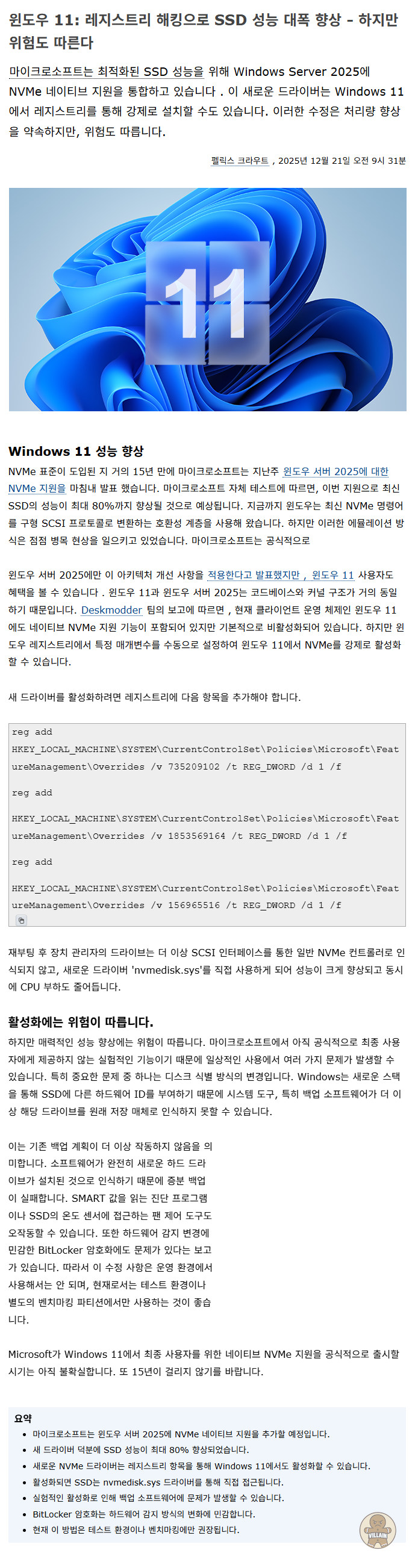 다행인 것은 올 상반기 정식 출시될 윈도우11 업데이트인 26h1 부터는 공식 지원될 수 있다는 소식입니다.
