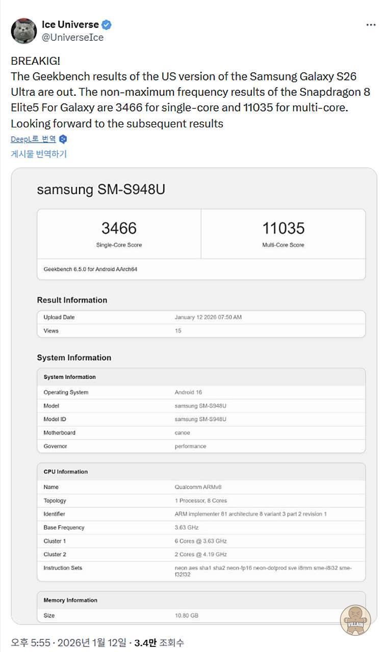 삼성 갤럭시 S26 울트라, 스냅드래곤 8 엘리트 Gen 5 탑재 긱벤치 6 DB 등재