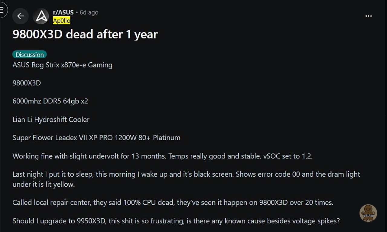 ASUS X870E 보드에서 또 라이젠 9800X3D 사망 보고 2건 추가