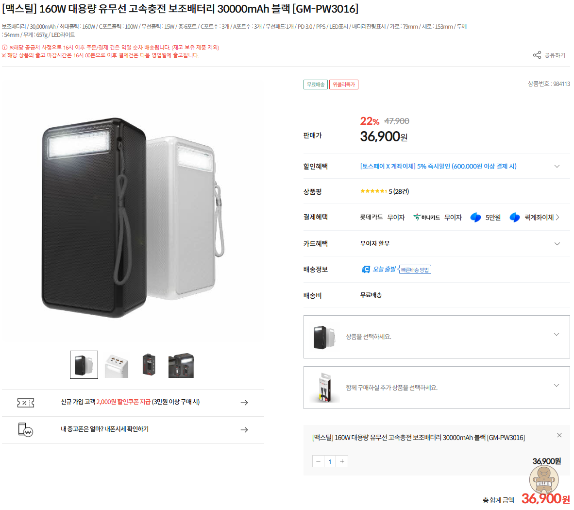 용량은 30000mAh로  할인가 36,900원이면 매우 저렴해 보입니다.