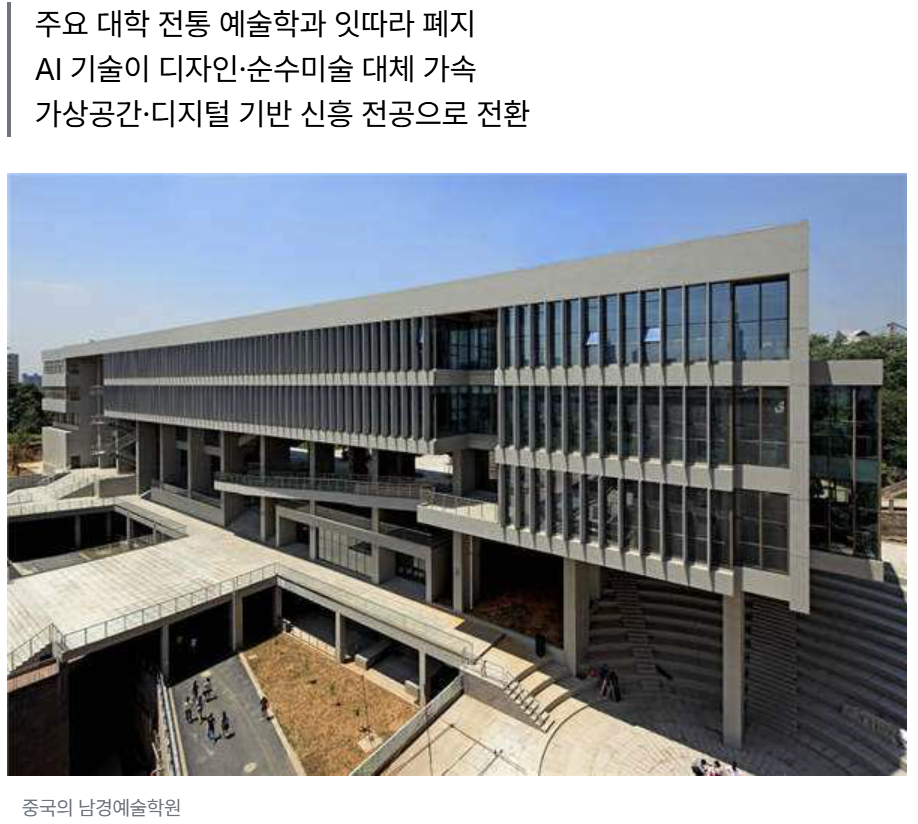 중국의 예술계열 대학 상위 5~6위 정도 하는 남경예술학원에서 디자인, 순수 미술 학과를 없애고 Ai, 디지털 기반 신흥 전공으로 모두 전환하고 있다고 합니다. 단지 중국의 사례 만으로 보기 어려운 게 국민대, 인하대, 계명대는 미대들에서도 Ai 학과로 변화하고 있습니다.
