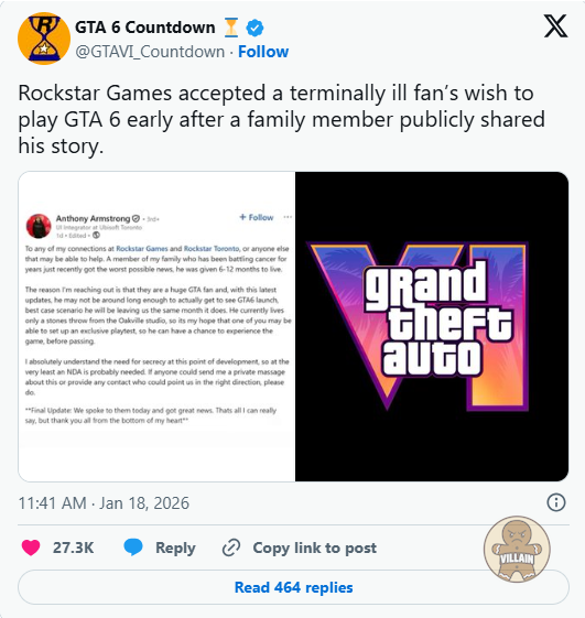 GTA6, 불치병 걸린 팬 위해 사전 플레이 제공 루머