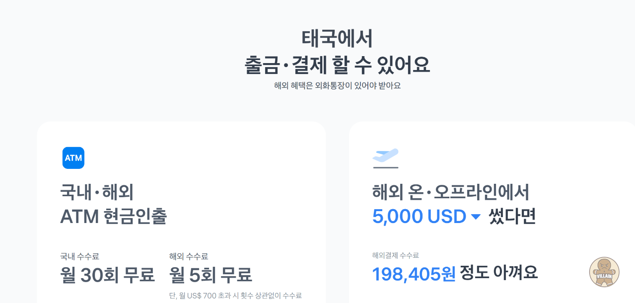 해외여행에 필수적인 건 환전에는 여러 방법이 있다. 태국은 아직까지 신용카드 결제를 받지 않는 가게가 많고 노점 등에서도 QR코드나 현금 만 취급하니 현금이 필수다. 여행산업이 발달한 태국은 다양한 환전 방법을 갖추고 있다. 원화를 그대로 들고 가서 현지 환전소에서 바꾸는 방법도 있고, 국내에서 환율 우대를 받아 달러로 환전해 가지고 간 뒤 현지 환전소를 이용할 수도 있다. 그렇지만 이 방법은 대체로 수수료가 많이 들고 번거로운 방식이다.