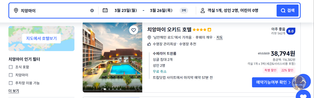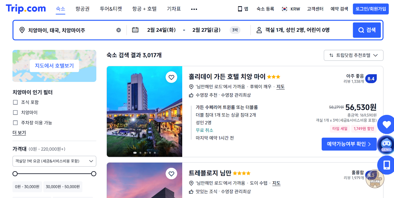 숙소는 거의 호텔을 이용하게 되는데 태국은 숙소의 가성비가 매력적이다. 지금은 약간 오른 편이지만 그래도 트립닷컴 기준으로 치앙마이에서 하루 3~4만원이면 더블베드에 에어컨, 욕실, 화장실을 갖춘 개인 룸을 예약할 수 있다. 잘 찾아보면 이 가격에 수영장까지 갖춘 곳도 있다. 일정이 변경됐을 때 숙박 1주일 전까지는 무료로 취소 가능한 방도 제법 많으니 부담없이 예약하자.
