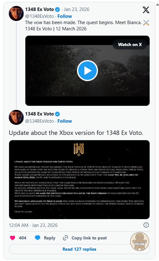 중세 이탈리아를 배경으로 하는 1348 Ex Voto 는 3인칭 시점의 액션 어드벤처 게임입니다. Gematsu의 보도에 따르면, Dear Villagers는 시네마틱 영상이 풍부한 이 게임의 출시일을 3월 12일로 발표했습니다. 하지만 안타깝게도 Xbox Series X|S용으로 계획되었던 게임은 취소되었습니다. 퍼블리셔 측은 "PC와 PlayStation에서 최고의 게임 경험을 제공하는 데 스튜디오의 역량을 집중하기 위해" 이러한 결정을 내렸다고 밝혔습니다.