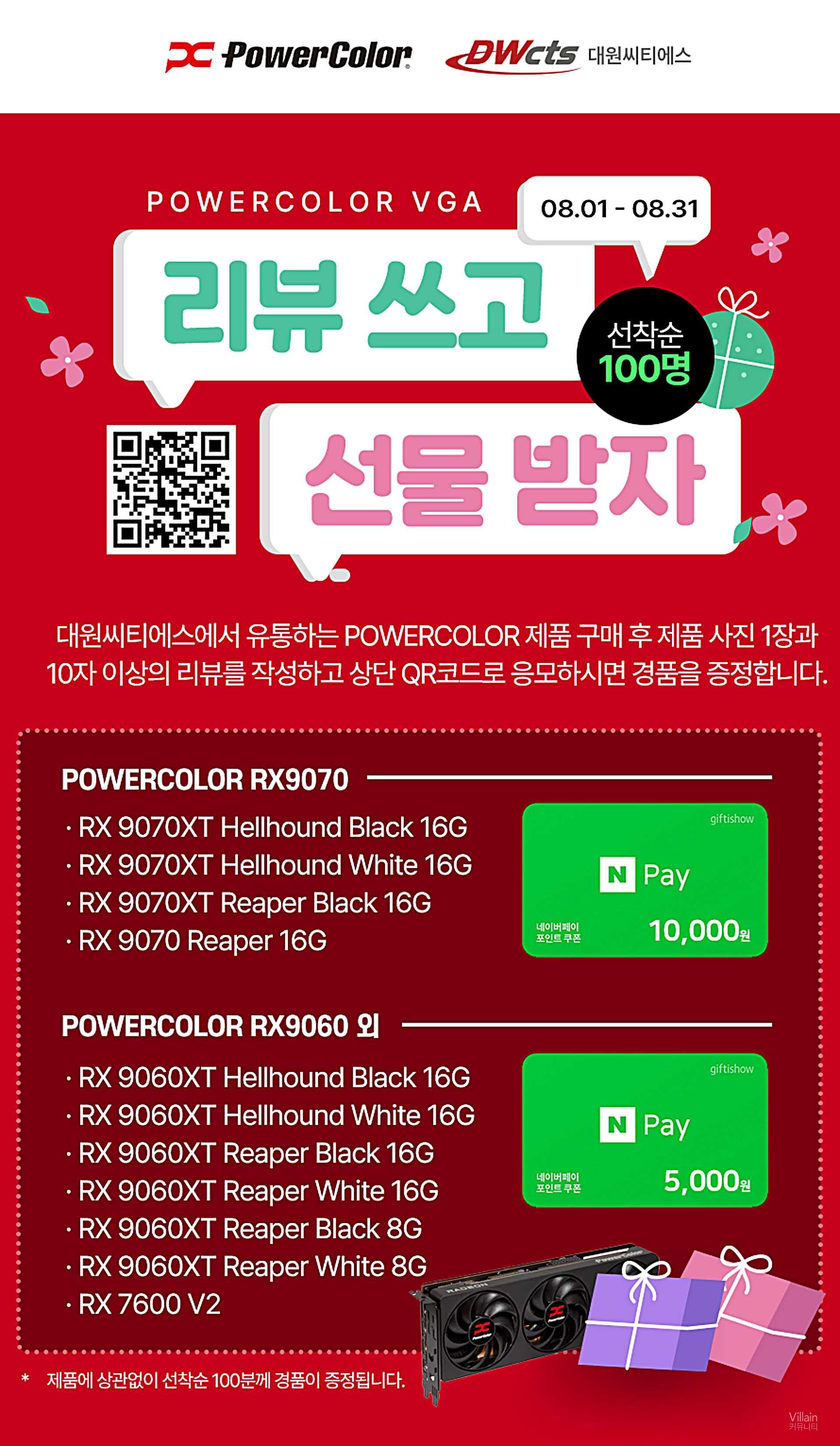 대원씨티에스가 PowerColor 그래픽카드 구매 고객을 대상으로 네이버페이 포인트 증정 이벤트를 진행한다. 대상 제품은 RX 9070 XT, RX 9070, RX 9060 XT 일부 모델과 RX 7600 V2 모델이며, 이벤트 기간은 8월 1일부터 8월 31일까지다.