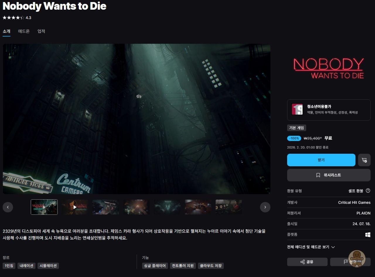 [에픽게임즈] 무료게임 - Nobody Wants to Die