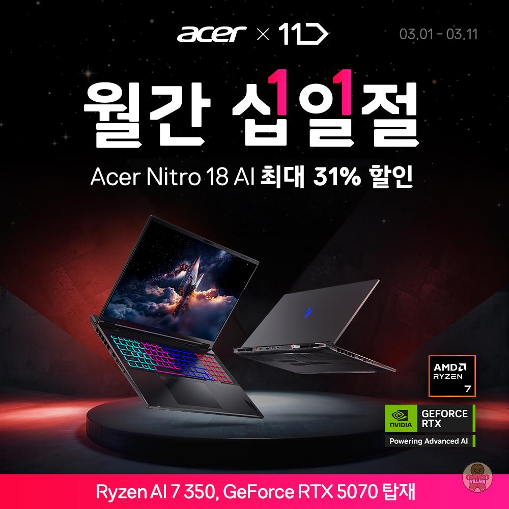에이서, 11번가 ‘월간 십일절’서 니트로 18 AI 게이밍 노트북 최대 31% 할인
