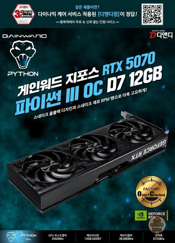 디앤디컴 '게인워드 지포스 RTX 5070 파이썬 III OC' 출시