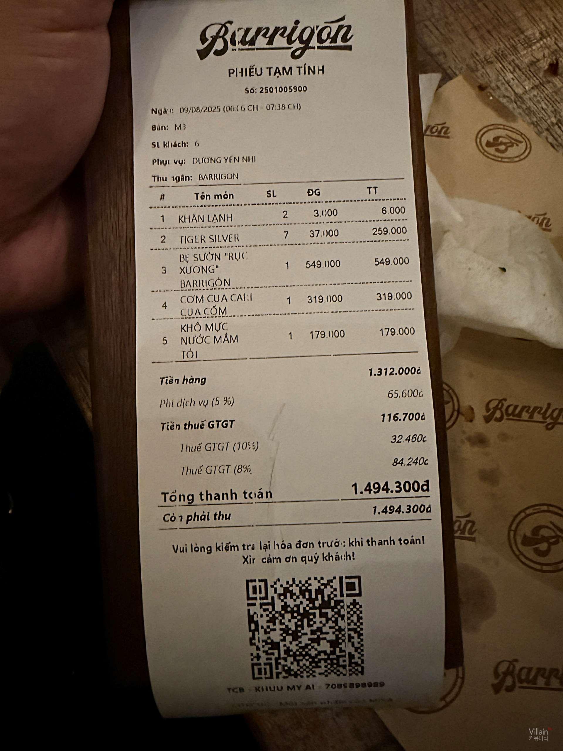 영수증 기준 총 1,494,300đ (약 8만원) / 2인.