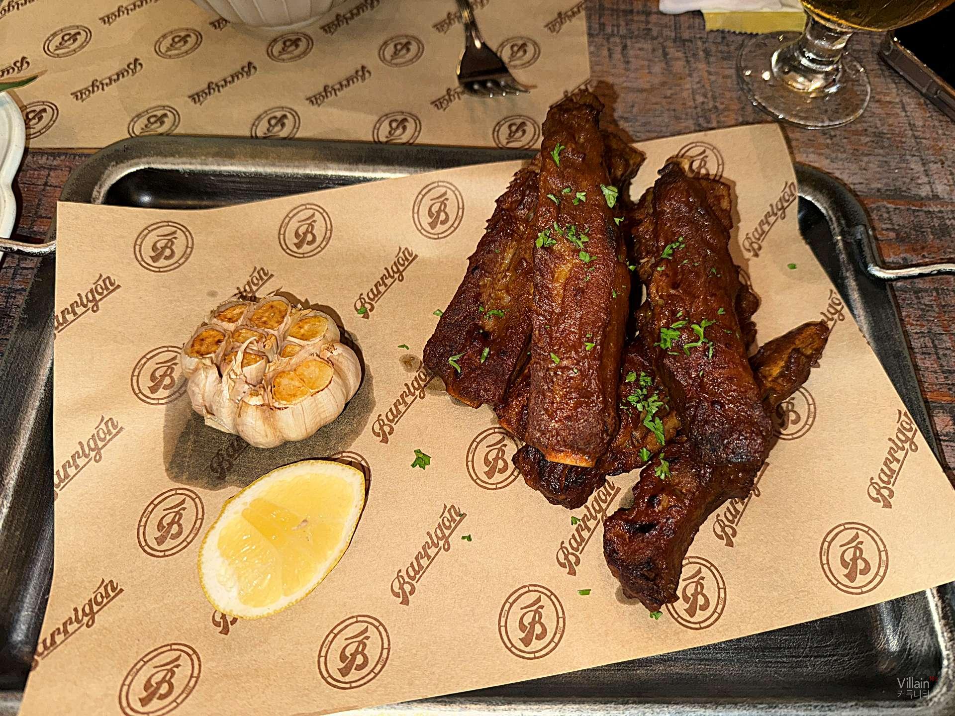 바비큐 스타일 돼지갈비. 겉은 바삭하고 속은 부드럽게 발라짐. 통마늘과 레몬이 곁들여져 나옴. 고기 질 좋음.