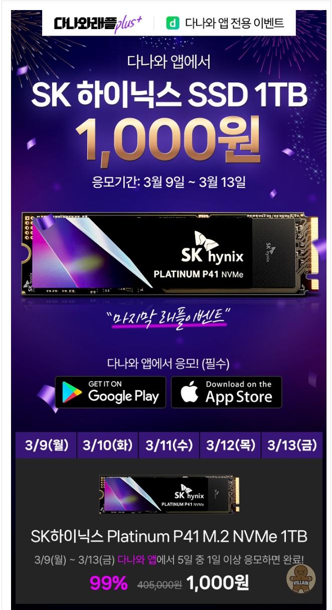 다나와 래플 SK 하이닉스 SSD P41 1TB 3월 9일 ~ 13일까지