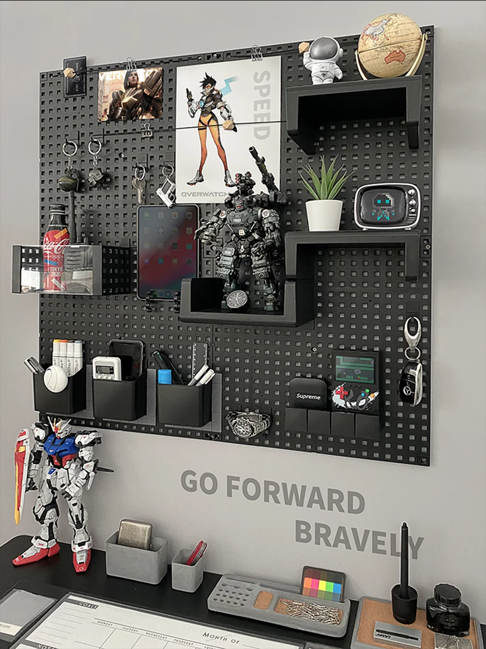 개인적으로는 철제 주문제작형 페그보드를 추천 드리는데 두께감이 있어 RGB 조명을 외곽에 둘러 붙이거나 타공안쪽에 RGB 조명을 부착하여 조명효과도 추가해 볼 수 있고 홀 거치용 소품의 종류가 이케아 제품과 비교하기 어려울 정도로 다양합니다.