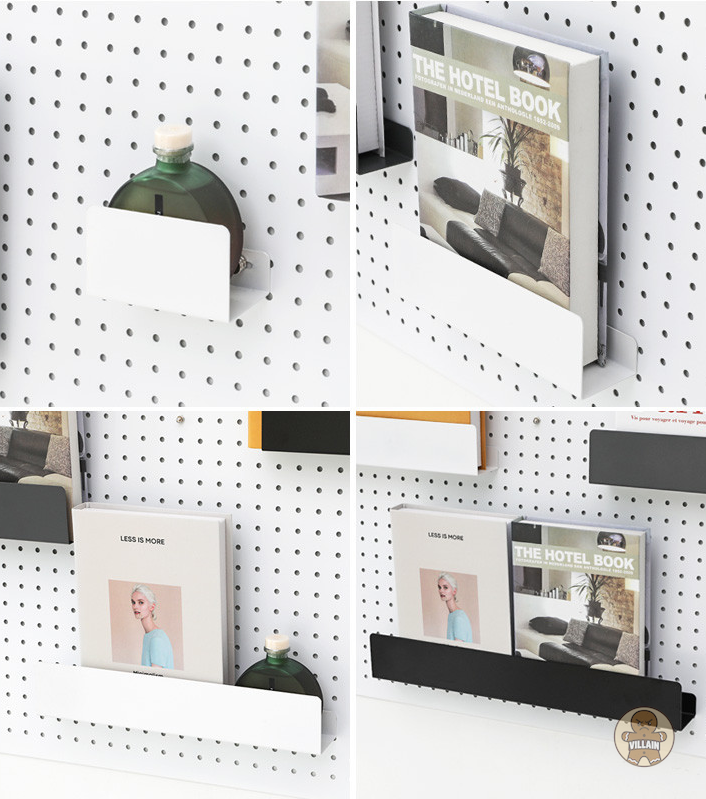 철제 타공판으로 화이트/블랙/그레이 색상을 선택 할 수 있고, 무엇보다 대형 사이즈 제작이 가능합니다. 다양한 길이와 사이즈의 후크, 바스켓 , 거치대 소품들을 판매하고 있어 개성있는 벽면 구성이 가능합니다.