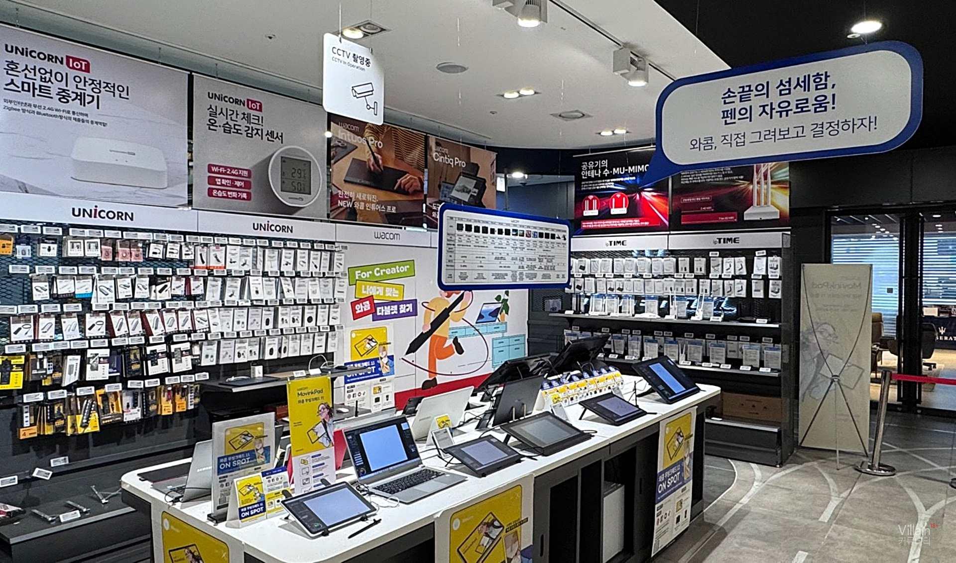 신티크, 인튜어스 등 와콤의 전 제품을 직접 체험할 수 있으며, 조립 PC·키보드 등 다양한 창작 장비와 함께 풀세트 구성 상담이 가능하다. 웹툰, 3D 디자인 등 작업 성격에 따라 적합한 타블렛과 디바이스를 제안하는 맞춤형 컨설팅이 제공된다.