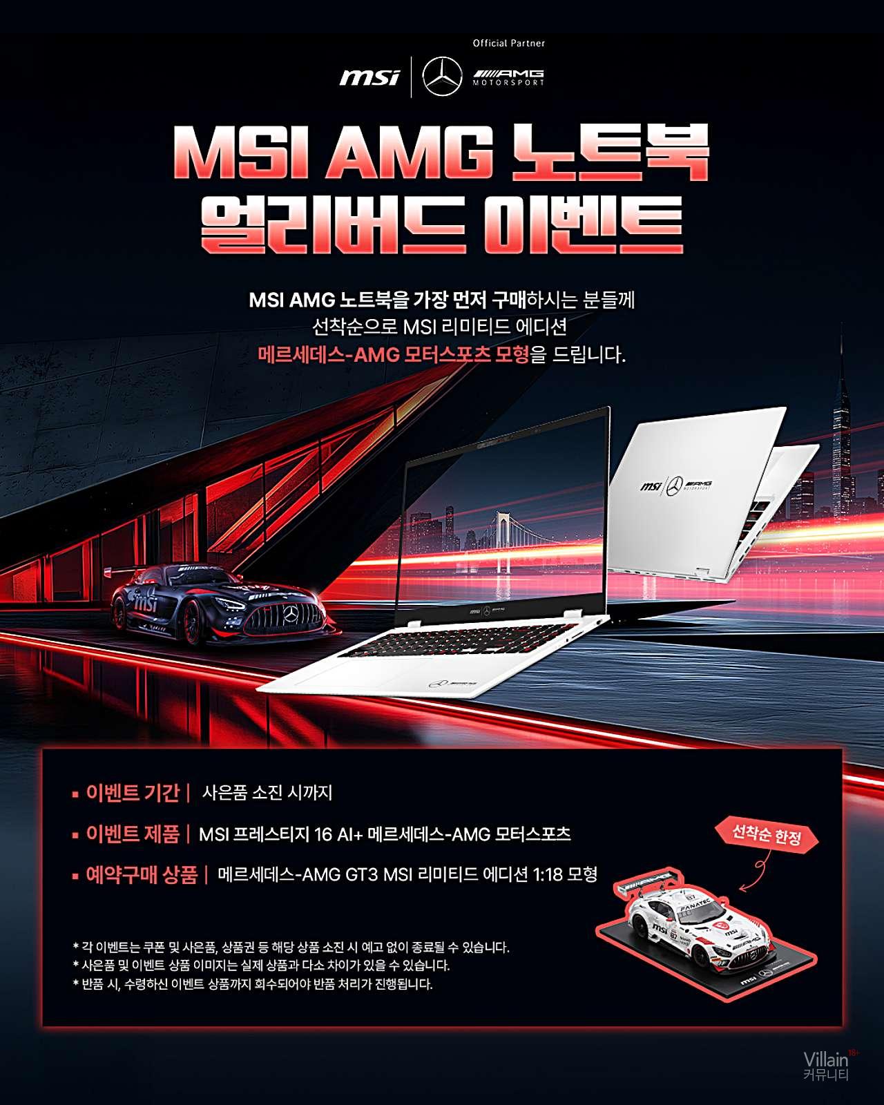 "MSI가 Mercedes-AMG와 협업한 프리미엄 노트북 ‘프레스티지 16 AI+’를 국내 출시했다. 구매 고객에게는 한정판 Mercedes-AMG GT3 1:18 모형카가 선착순 증정된다."