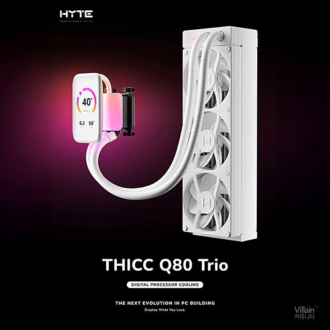 서린씨앤아이가 하이트(HYTE)의 신형 일체형 수냉 쿨러 ‘THICC Q80 Trio’를 정식 출시했다. Q80 Trio는 하이트가 최초로 선보인 일체형 수냉 쿨러 Q60의 후속 모델로, 360mm 크기와 두께 52mm 라디에이터를 적용해 냉각 성능을 높였다. 라디에이터에는 듀얼 하모닉 워터 펌프가 탑재돼 2000~4400RPM 범위에서 속도 조절이 가능하며, 항공우주 등급 세라믹 베어링으로 마찰 계수와 무게를 줄였다.