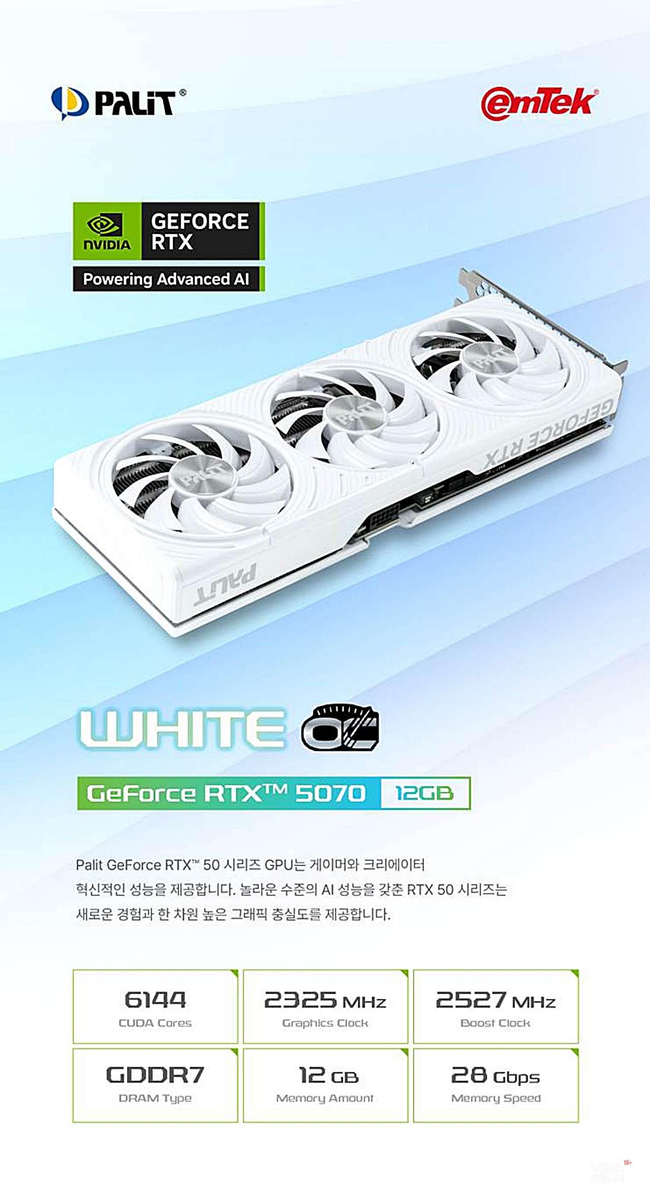 이엠텍이 Palit 지포스 RTX 5070 WHITE OC D7 12GB를 출시했다. GDDR7 메모리, 6,144 CUDA 코어, Boost Clock 2,527MHz와 DrMOS 전력 설계로 안정성과 성능을 강화했으며, 화이트 디자인과 2 Slot 설계로 SFF 및 화이트 빌드에 적합하다.