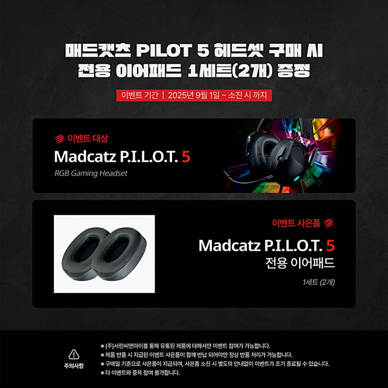 컴퓨터 주요 부품 유통 전문 업체 서린씨앤아이는 매드캣츠 P.I.L.O.T. 5 게이밍 헤드셋 구매 고객을 대상으로 전용 이어패드 1세트를 증정하는 이벤트를 진행한다고 밝혔다.