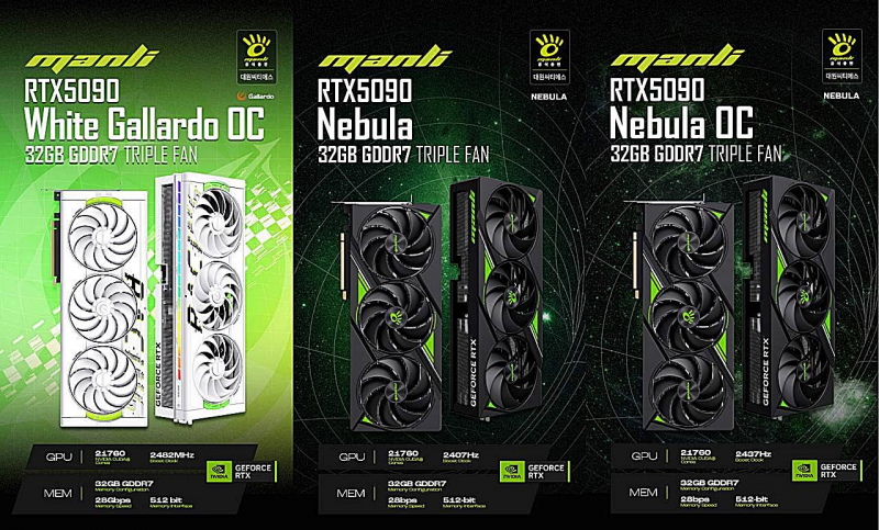 출시된 제품은 ▲Manli GeForce RTX 5090 Gallado OC 32GB White, ▲Manli GeForce RTX 5090 Nebula 32GB, ▲Manli GeForce RTX 5090 Nebula OC 32GB로 나뉜다. 세 모델 모두 32GB GDDR7 메모리, 트리플 팬, 대형 히트싱크, 메탈 백플레이트, HDMI 2.1a·DisplayPort 2.1 기반 8K 출력 지원을 공통으로 갖춘다.