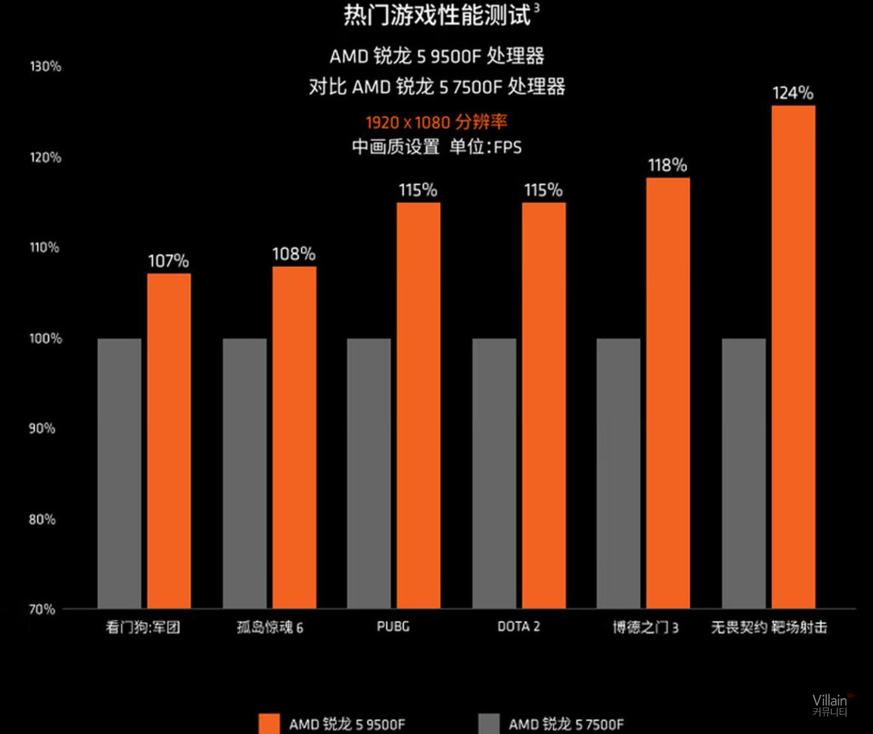 AMD 공식 자료에 따르면, 라이젠 5 9500F는 NVIDIA RTX 5060 Ti 그래픽카드와 DDR5-6000 메모리를 조합했을 때, 6종 게임(1080P 중간 옵션) 테스트에서 라이젠 5 7500F 대비 7~24%의 프레임 향상을 보였다.
