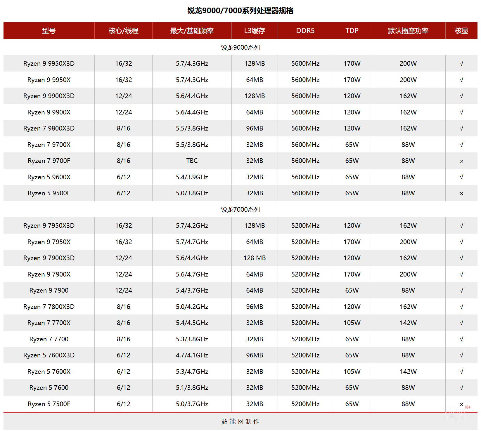 참고로 현재 박스 제품 가격은 라이젠 5 7500F가 949위안, 라이젠 5 9600X가 1449위안이며, 세부 스펙 차이는 아래 표를 통해 확인할 수 있다.