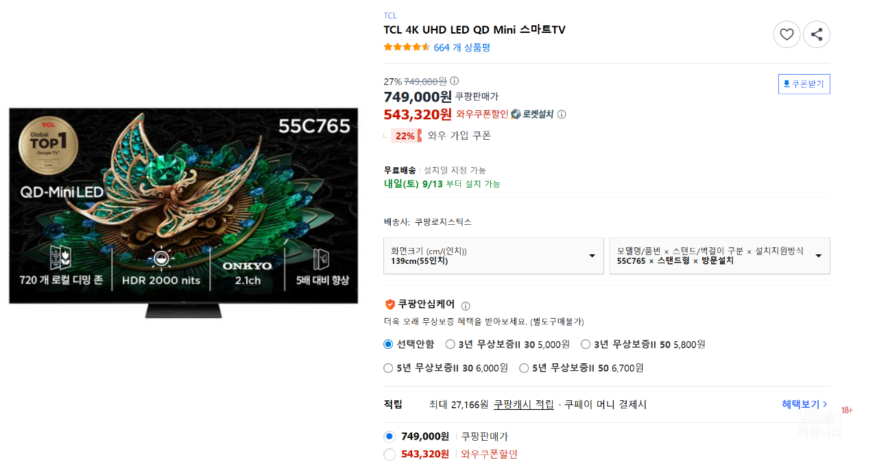[쿠팡] TCL 4K UHD LED QD Mini 스마트TV 역대급 할인/와우쿠폰 543,320원