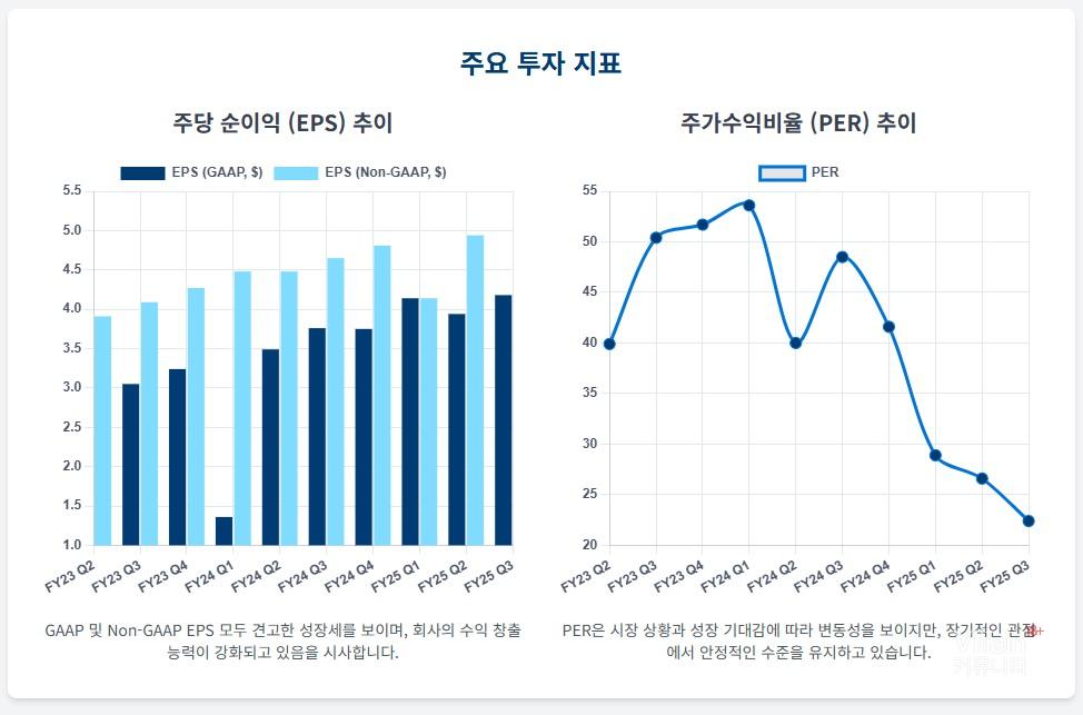 다른 데이터도 살펴 보겠습니다. 분기별 PER(주가수익비율) 추이를 보겠습니다. 회계연도 2023년 2분기 PER은 33.9배 였습니다. 이것이 한 때 53.6배까지 치솟다가 서서히 빠지면서 현재는 22.4배에 도달한 상황입니다. 총매출은 꾸준히 상승한 것과 달리 괴리감이 조금 존재한다는 느낌이네요. 아무래도 2024년을 기점으로 생성형 인공지능 서비스들이 급부상한데다 2024년 1분기(회계연도) 영업이익이 한 번 시원하게 빠진 것이 투자자 심리에 큰 영향을 준 것 같습니다. 회사의 기초체력(EPS)은 견고했음에도 미래 성장성에 대한 시장의 의구심이 주가수익비율의 하락으로 이어진 것으로 분석할 수 있겠습니다. 어도비가 이 심리를 어떻게 돌파하는지가 향후 주가 변동에 영향을 주겠네요.