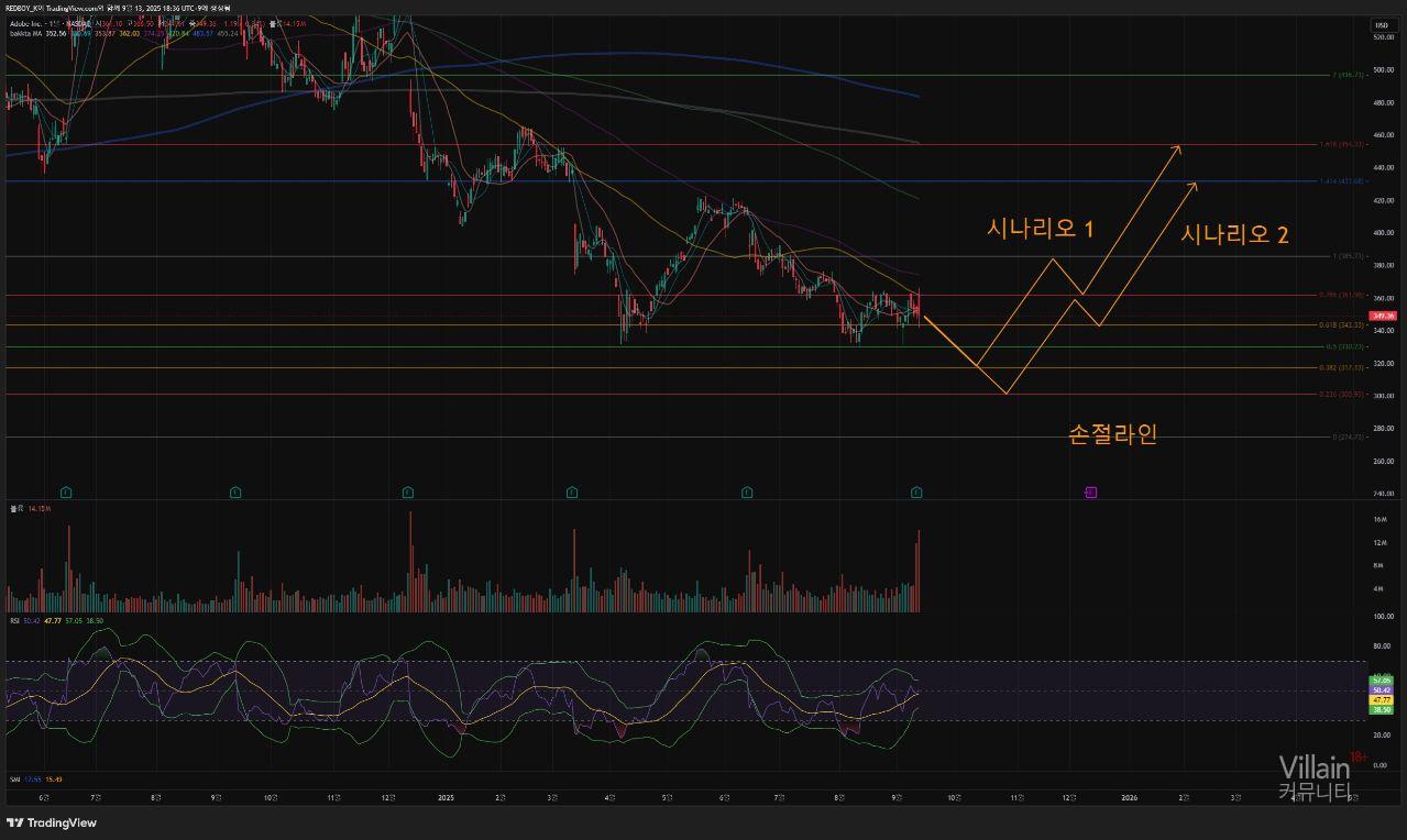 <차트쟁이 입장에서 생각해 본 어도비 매수 시나리오입니다. 어디까지나 제 관점입니다 = 출처는 트레이딩뷰>